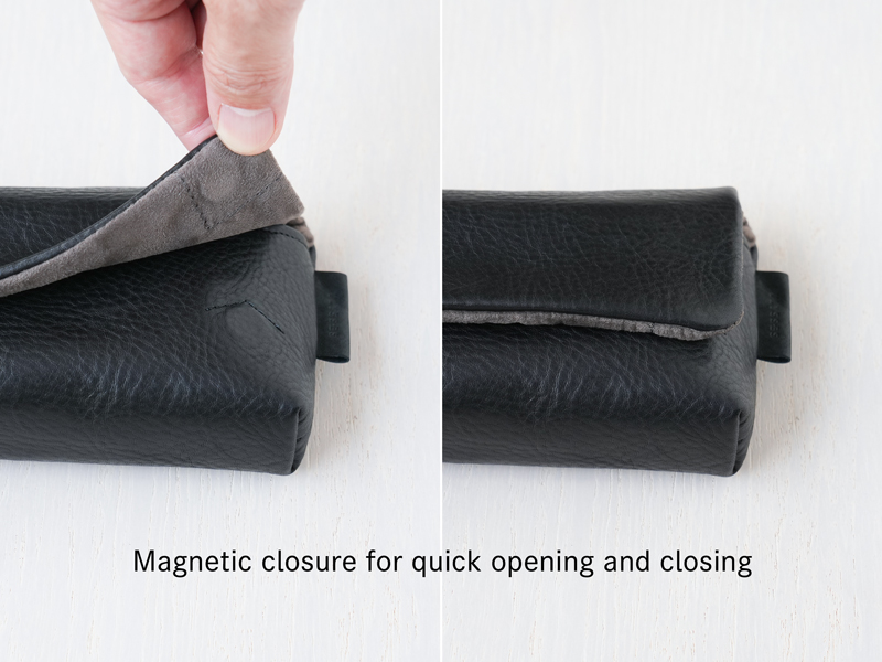 This indispensable magnet is embedded in both sides of the pouch—in the lid and the case and you can open and close the lid easily and rightly. Since the magnet is embedded inside, you can’t see it, keeping the style simple but adding a unique professional finish.